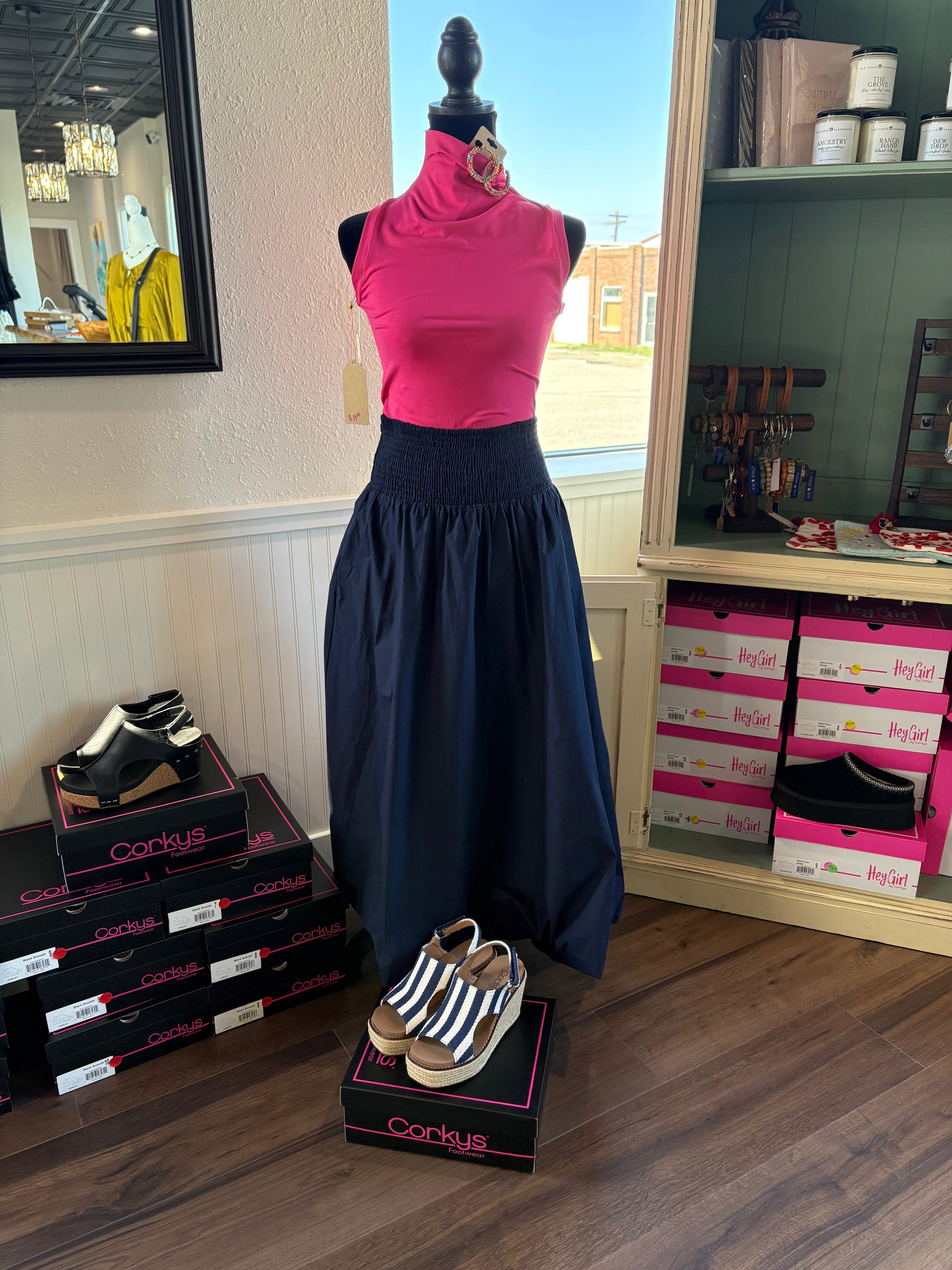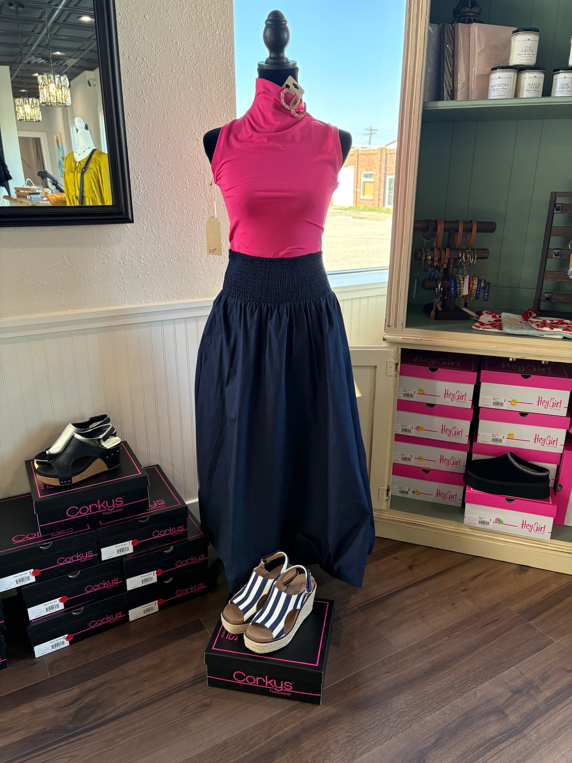 This skirt is designed to capture attention. Featuring a flexible fit, a broad elastic waistband, and a distinct bubble hem, it pairs effortlessly with both upscale and casual tops. Crafted from a cotton blend, it’s set to become your favorite piece this fall.