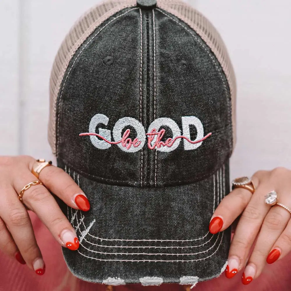 Katydid’s Be The Good Hat features embroidered detailing on a classic trucker cap with a curved brim. The distressed design offers a vintage, broken-in appearance. It includes an adjustable strap and a breathable mesh back for comfort. Crafted from 80% cotton and 20% polyester, this one-size-fits-most cap combines durability with style.