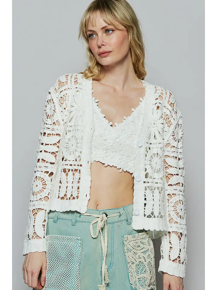 This crocheted cardigan features a cropped fit with a V-neck and long sleeves. It is designed with a button closure and is available in one size.