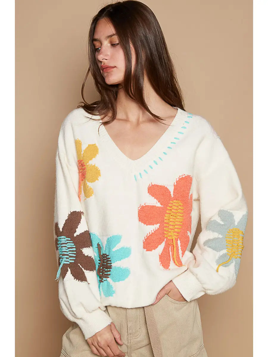 This beautiful V-neck sweater will keep you warm and cozy all winter and spring long. And the floral detail will have you smiling from ear to ear. Made of soft Acrylic fabric this sweater is a must have this fall!