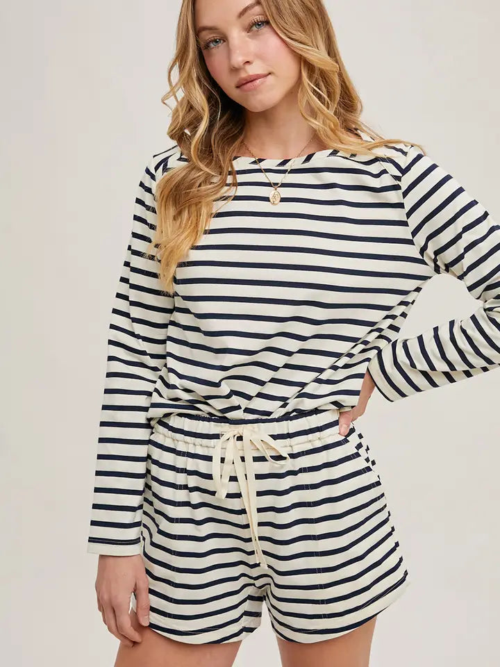 The Striped Knit Pullover Top and Shorts Set with Drawstring combines comfort with casual elegance. The relaxed-fit pullover showcases a timeless striped design, while the matching shorts feature an adjustable drawstring for a personalized fit. Made from soft, breathable knit fabric, this set is perfect for lounging, errands, or casual days out. Pair with sneakers for a sporty look or dress it up with sandals and accessories for effortless style. Model is 5'9" and wears a Small.